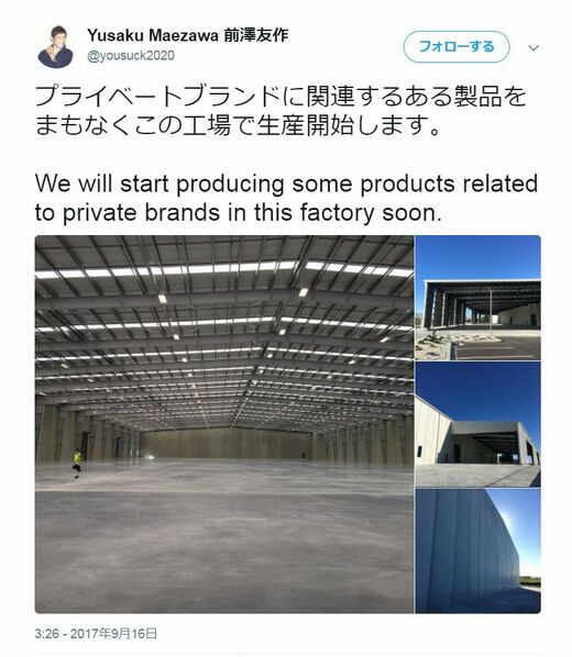 「プライベートブランド(PB)に関するある製品をまもなくこの工場で生産開始します」――。9月16日、ファッションECサイト「ZOZOTOWN(ゾゾタウン)」を運営するスタートトゥデイの前澤友作社長(41)は、自身のツイッターでこうつぶやき、”新工場”の写真を公開した。
