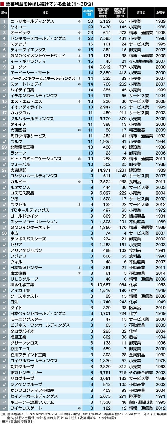 政治・経済・投資 最新!「連続増益トップ323社」ランキング 1位は30年のニトリ、2位は29年のヤオコー 3分で読める 公開日時:2017/09/28 05:00 東洋経済オンライン編集部 フォロー 1/6 PAGES 2/6 PAGES 次ページが続きます:【続いて7年連続増益の会社】 3/6 PAGES 4/6 PAGES 5/6 PAGES 6/6 PAGES