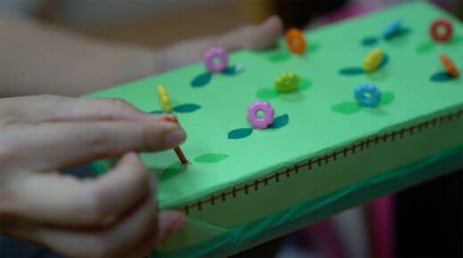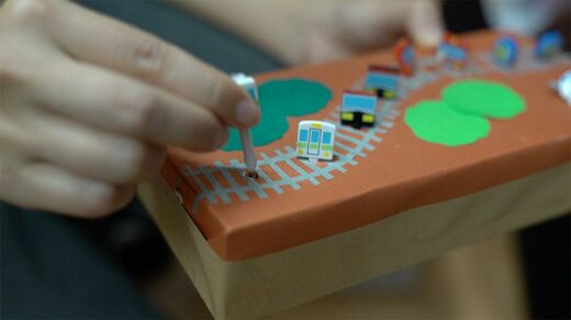 同じ「教材」でも、子どもたちの興味関心に合わせるため、複数のデザインを準備しているものも多々あります。お弁当に使うピックとティッシュペーパーの箱を使って作成された「ピン挿し」は、手先の操作を学ぶために使用。お花のピックを使ってお花畑を作ったり、電車のピックには線路を描いたりと、工夫しています。