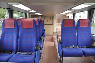 車内も2100形をイメージしており、運行時には補助席となる1階のシートは電車の座席と同じ青地に赤い水玉模様の生地に張り替えた。2階席も模様こそ異なるが、青と赤のカラーリングに変更。壁も2100形をイメージしたベージュ色のラッピングを施しているほか、一見すると金属製の窓枠に見える窓下の銀色の部分も「2100形(の窓枠部分)に極力近づけるために銀色のステッカーを張った」という凝りようだ。