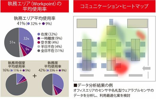 実際、シンガポールでの実証実験では、机や椅子、扉などに小型センサーを取り付けて、オフィスフロアや会議室の利用状況、人の動きなどのデータを収集しました。今後、名札型ウエアラブルセンサーとAIを活用し、働いてる方々の組織の活性度(幸福度)を計測・分析し、社員同士のコミュニケーションを考慮して、生産性を高めるオフィススペースの検討を行う予定です。