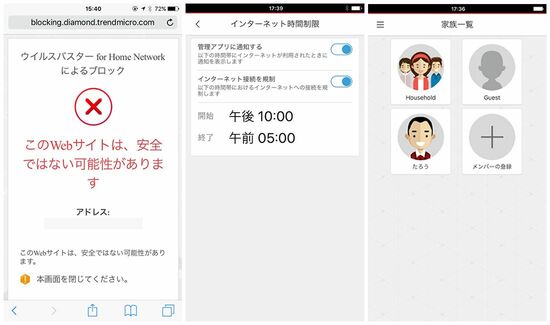 また、娘の景子がはまってしまったゲームアプリや出会い系アプリといったアプリ使用の監視にも対応。ホームネットワークに接続された端末からインターネットを利用する時間の制限も可能となる。娘や息子といった家族のメンバーごとに設定ができるので、子どもが何時間もゲームにはまってしまうことを防止できる。