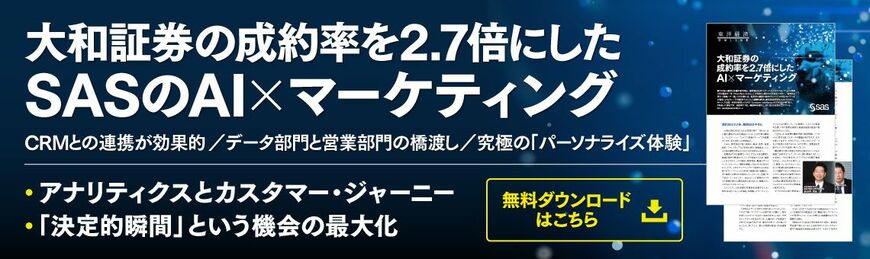 こうした取り組みは、今では現場の営業員からも評価され満足度は84%と高い。しかしそこに至るまでには越えるべきハードルもあった。リテールマーケティングを高度化し、AIを使いこなす組織になるためには何が必要なのか。詳しくは大和証券とSAS Institute Japanのキーマンが対談した以下のPDFからご確認いただきたい。