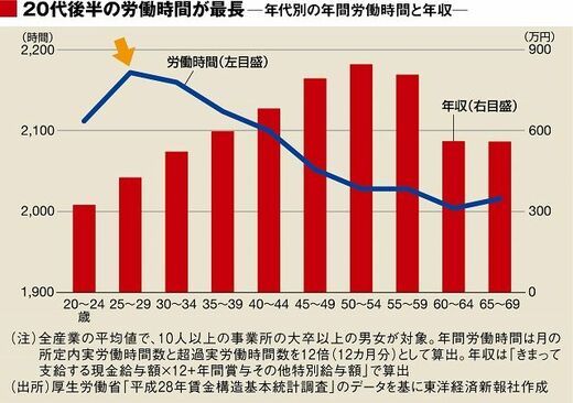 そして今回のランキングは、大卒・大学院卒以上の25~29歳(男女)の一般労働者(フルタイムで働く労働者で正社員か非正社員かは問わない)の値を使った。就活生が3~4年先の待遇を見るという理由もあるが、年代別の労働時間でみると、25~29歳の層が労働時間が最も長くなっている。20代後半をピークに労働時間は減っていく一方、賃金(年収)は上昇していく傾向にある。若いうちに多く働き、年々待遇がよくなっていく、日本の年功序列型賃金が垣間見える。