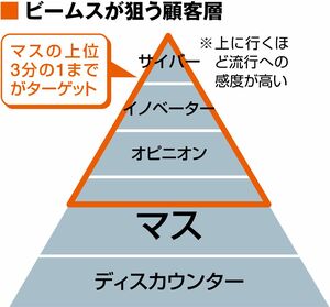 流行の変化にいちばん早く気づくのが「サイバー」。流行の先端を取り入れるのが「イノベーター」。流行を周囲に発信する、おしゃれ番長のような存在が「オピニオン」。そして「マス」。そう名付け、マスの上位3分の1までをターゲットにしている。下に行くほどゾーンが広い。