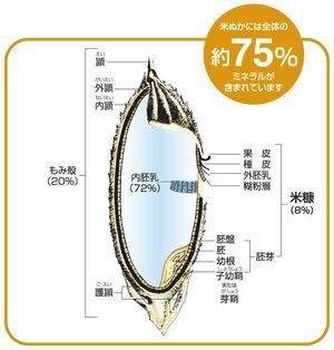 米ぬかは、玄米の重量のうちわずか10%ですが、しかし全体の約75%に相当する栄養成分が含まれています。中でもγ-オリザノールとフェルラ酸という天然成分が注目されています。γ-オリザノールは、美と健康の源といわれ、皮膚の血行をよくして皮脂の分泌を促進し、肌の表面を保護します。さらに紫外線をブロックして、老化した角質を除去する作用があります。またフェルラ酸は、おコメのポリフェノールとも呼ばれ、美白効果があり抗菌作用があります。