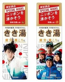 また、この冬を代表するアスリートの活躍を応援する「きき湯スペシャルモデル」として、男子フィギュアスケートの「羽生選手バージョン」(森林浴調の香り)と、「スキー選手(葛西選手・髙梨選手・伊藤選手・渡部選手)バージョン」(柑橘の香り)も11月1日より数量限定で登場。いずれも、香料成分中に天然エッセンシャルオイル配合し、自然なやすらぎの香りでいやします。