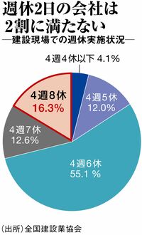 世間ではもはや当たり前となった週休2日制だが、建設現場ではまだまだ少ない。業界団体の一つ、全国建設業協会の調査によれば、建設会社3106社のうち、おおむね4週8休を実現している会社はわずか16.3%にとどまる。