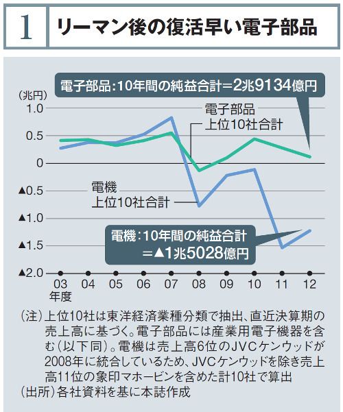パナソニックやソニー、シャープといった日本を代表する電機メーカーが失速する中、電子部品メーカーが気を吐いている。売上高上位10社の10年間の純益合計を比較すると、電機は約1兆5000億円の損失となったのに対し、電子部品は約2兆9000億円を稼いだ。