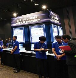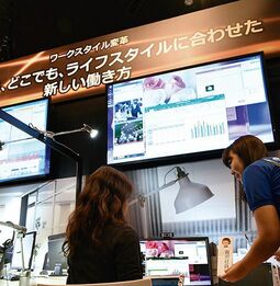 働き方改革に向けて、自宅をはじめ場所を選ばない働き方を支えるテレワーク体験コーナーを設置。それを実現する、USBキーを利用して端末から会社のPCに安全にアクセスできるリモートアクセス「MagicConnect」、ウェブ会議システム「MeetingPlaza」、ビジネスチャット「TopicRoom」などのサービスを紹介した。