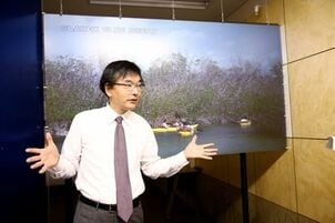 小池教授が生み出した数々の発明品の展示室に招かれる。入ってすぐ目に飛び込んでくるのが、見たこともないほど臨場感のある映像を代わる代わる映している、1枚の大きな板だ。部屋の電気を消すと、板の映像はまるで現実のようにリアルに迫ってくる(写真)。