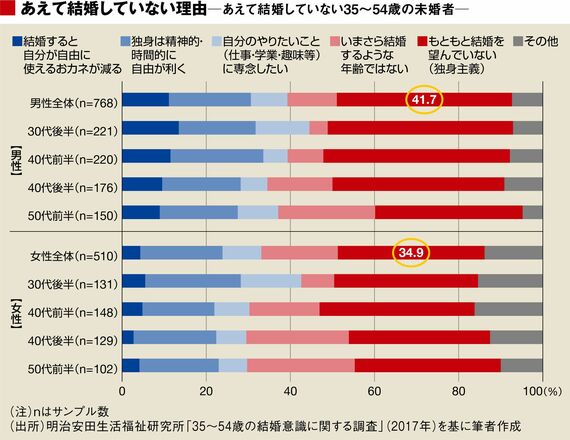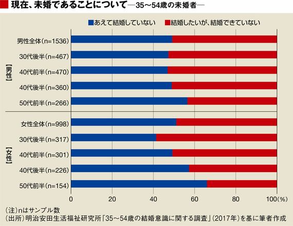 では、35~54歳の未婚者は未婚についてどのような意識があるのか見ていきたいと思います。まず、「あえて結婚していないのか、結婚したいができていないのか」をたずねたところ、「あえて結婚していない」と回答した男性は、35~49歳では5割を下回っていますが、50代前半では56.5%となっています。女性はより顕著に年齢が高いほど「あえて結婚していない」の割合が高く、50代前半では66.0%と30代後半の41.3%より24.7ポイント高くなっています。