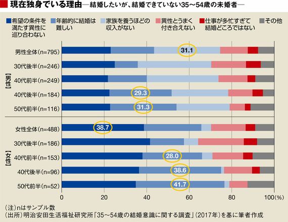 一方、「結婚したいが、結婚できていない」と回答した人に対して、その理由をたずねたところ、男性は「家族を養うほどの収入がない」(31.1%)、女性は「希望の条件を満たす異性に巡り合わない」(38.7%)が最も高くなりました。「希望の条件を満たす異性に巡り合わない」の割合は、男性が各年齢層で約2割であるのに対し、女性は約3~4割と男性に比べて高く、年齢が低いほど割合は高くなっています。