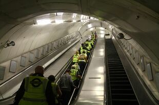 ロンドン地下鉄のエスカレーター袖部分には、必ず「右側に立ってください(歩く人のために左側を空けてください)」という表示と、数メートルおきに非常ボタンが設置されているのだが、撮影のためにこれらはすべて撤去されていた。