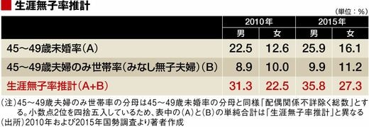 これで見ると、45~49歳の夫婦のみ世帯に属する男女の構成比は2010年も2015年もほぼ10%前後であることがわかりました。つまり、未婚率プラス10%程度が生涯無子率ということになります。2015年の実績で言えば、男35.8%、女27.3%が生涯子無しということになるのです。男女で10%の差が発生するのは、生涯未婚率でも同様ですが、男女未婚者の人口差によるものと再婚形態の違いによるものです(これについては2017年5月26日配信の「未婚男が割を食う『バツあり男』の再婚事情」で詳しく書いています)。