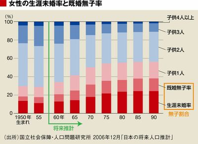 ちなみに、やや古い資料となりますが、国立社会保障・人口問題研究所が2006年時点で出した年代別女性の無子割合の試算は以下の通りでした。どうして女性のみかというと、男性の場合は離婚などした場合に、その男性が無子だったのか有子だったのか判別つかないからです。