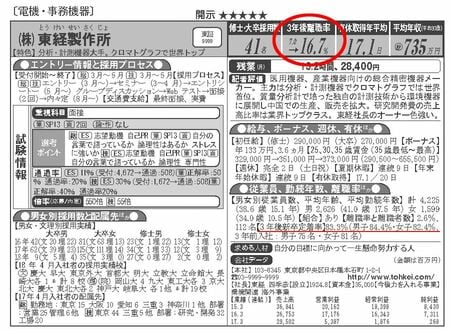 「3年後離職率」は、2005年秋発売の2007年版から、多くの先輩たちの強い要望によって、調査・掲載を始めたものです。それ以後、就職四季報には平均年収などと並んで、最も目立つ位置に掲載しています。