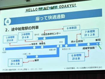 しかし、ダイヤ改正後、小田急の所要時間は8分短縮され、1時間8分になる。JRとの時間差が10分にまで縮まれば、座って通勤できる小田急を利用したいと考える人も少なくないだろう。このほか、海老名、向ヶ丘遊園、成城学園前などでも通勤時の始発列車の本数が増える。