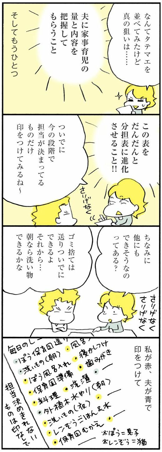 ライフ #ほしいのは「つかれない家族」 前の記事 次の記事 「家事の分担」でモメる夫婦をラクにする方法 あまり厳密にやろうとしすぎてはいけない 3分で読める 公開日時:2017/11/24 06:00 ハラユキ イラストレーター、コミックエッセイスト フォロー 1/7 PAGES 2/7 PAGES 3/7 PAGES 4/7 PAGES 夫に家事育児の量と内容を把握してもらう 次ページが続きます:【感情に訴えても効果がなかった過去】 5/7 PAGES 6/7 PAGES 7/7 PAGES