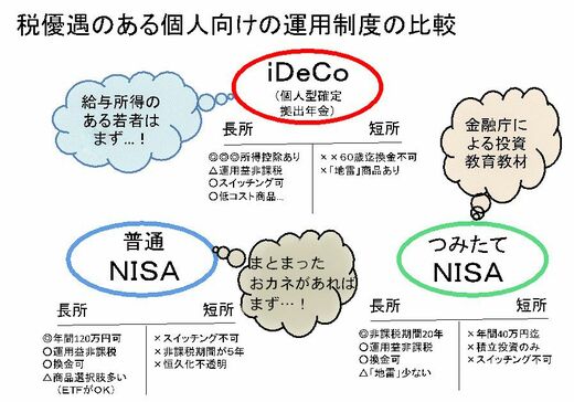 一方、すでに投資できるまとまったおカネがある場合には、通常のNISAは、つみたてNISAの年間40万円よりもかなり大きな年間120万円の非課税投資枠があるので、まずはこちらから利用するのがいいだろう。投資対象は、ETF(上場型投資信託)で手数料の低廉な物をお勧めする。各制度の特徴と長所・短所について、図にまとめてみたので、参考にされたい。