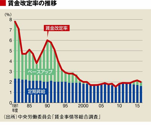 2017年の春闘賃上げ率は2.11%(厚生労働省調べ)だった。連合の調査では定期昇給は1.69%となっているので、ベースアップは0.4%程度となる。実際、厚生労働省の毎月勤労統計によれば、2017年度入り後の一般労働者の所定内給与は前年比0.4%(4~9月の平均)で、ベースアップと一致している。