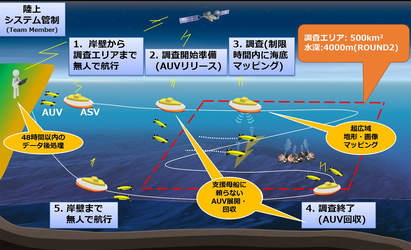 各チームが競うのは、水深4000m海域における超広域高速海底マッピングの技術だ。ラウンド1では、広域かつ高速での深海探査に必要な技術評価試験が行われ、2018年10月から始まるラウンド2では、24時間以内に最低250km2以上の海底マップの構築と海底ターゲットの写真撮影(10枚)に挑む。