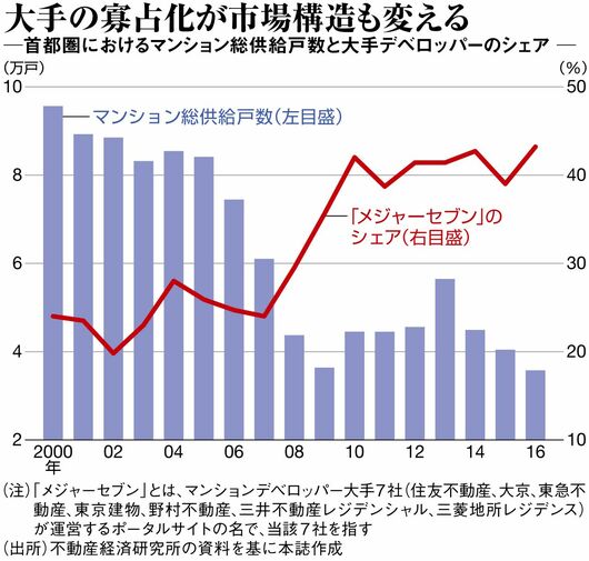 一方、「メジャーセブン」と呼ばれる大手デベロッパー7社のシェアは、総供給戸数と逆相関をなす形で43%まで上昇してきている。