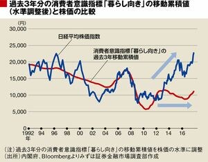 過去3年分の消費者意識指標「暮らし向き」の移動累積値の水準を調整し、日経平均株価と比較すれば、足元の株価は「暮らし向き」の実感と大きく乖離していることがわかる。