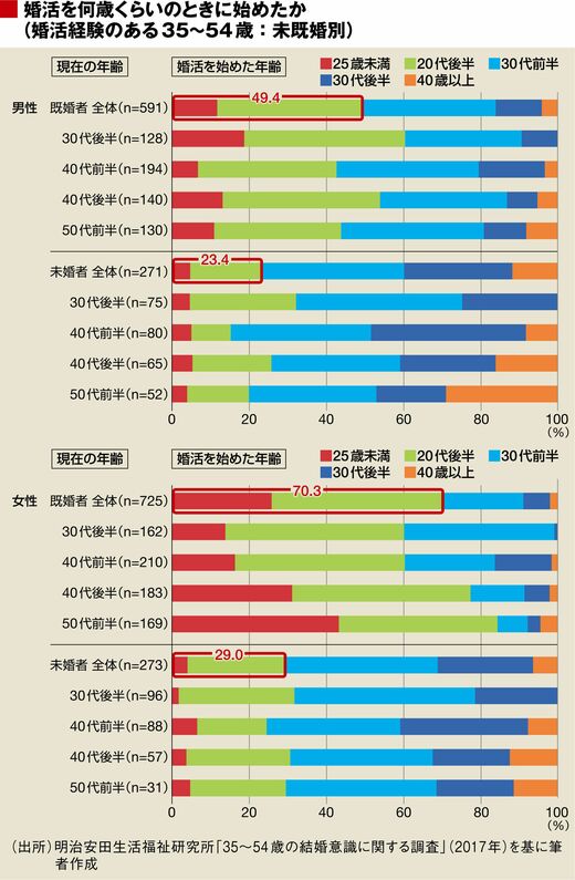 ところで、35~54歳のみなさんは婚活を何歳くらいから始めているのでしょうか。婚活経験のある人に対し、何歳くらいに始めたかたずねたところ、未婚者よりも既婚者のほうが、若い頃から婚活を始めていたことがわかりました。
