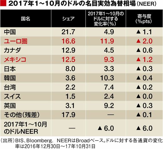 しかし、為替は常に相手のある世界であり、「ドル安の年」にもかかわらず円高が進まなかったのは、ドル売りの「受け皿」がほかに存在したからだ。結論から言えば、それはユーロとメキシコペソだった。ドル名目実効為替相場の下落6%のうち3.2%ポイントがこの2通貨の上昇で説明できる。2017年のドル安は「ドルが弱かったからではなく、ユーロやメキシコペソが強かったから」という説明もできる。この2通貨の急騰を読めなかったことが、筆者の誤算だったと自己分析している。