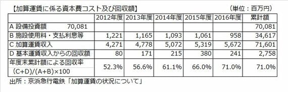この通達基準にしたがって、京急は現在の加算運賃の回収状況を以下のように示している。