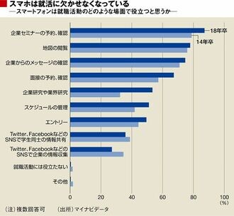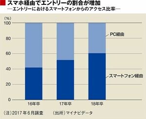 ここからは、学生が就活でどのようにスマホを活用しているか、見ていきます。就職情報サイト「マイナビ」にエントリーする際、2年前の2015年時点では「パソコン経由」が6割を占めていました。しかし、今年は「スマホ経由」が6割となり、比率が逆転しています(3月末時点)。またマイナビの調査では、「就職情報サイトのアプリ」の使用率は64.5%(前年比15.5ポイント増)と、前年より大きく増加しています。