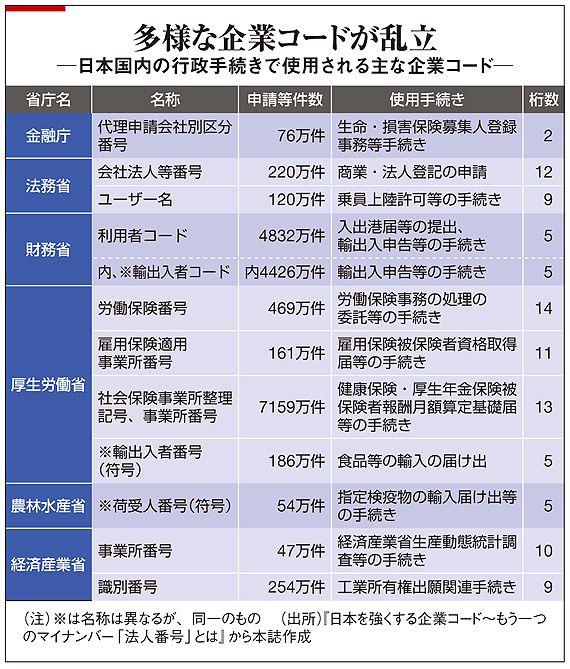 そもそも、日本にはすでに企業コードはいくつも存在しており、上場企業なら証券コード、輸出入企業なら輸出入者コードが割り当てられている(表)。それぞれの業界の中で企業番号が割り振られているケースも少なくない。