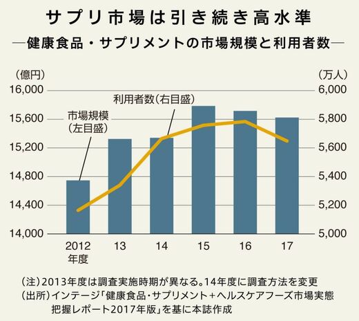5600万人もの日本人が利用する健康食品・サプリメント。インテージの調べによれば、その市場規模は、年間で約1兆5600億円と巨大だ。2015年春に機能性表示食品制度が始まり、メーカーが科学的根拠を国に届ければ健康効果をパッケージに表示できるようになったことで、次々と新商品が登場。今後さらなる市場拡大が予想される。