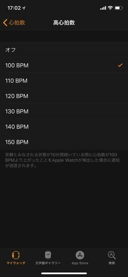 また、静止状態では一般的に、脈拍数が100回/分を超えることが少ないと言われていることから、静止しているのに10分間、100を超える脈拍数を記録すると、Apple Watchでそのことが通知される仕組みも備えた。iPhoneの「Watch」アプリから「通知」を開き、「心拍数」アプリをタップすると、通知のオン・オフ、通知のしきい値となる心拍数を設定することができる。