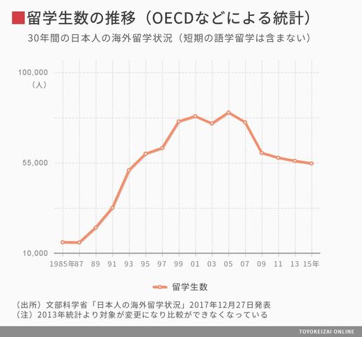 内向きの根拠とされる日本人留学生の減少はこれを元データとしていることが多かったのです。ただ、2013年度より集計方法が変わり、外国人学生(受け入れ先の国籍を持たない)から現地の高等教育機関に在籍する外国人留学生(勉学を目的として移り住んだ学生)が対象になったため、過去のデータとの比較が難しくなっている現状があります。