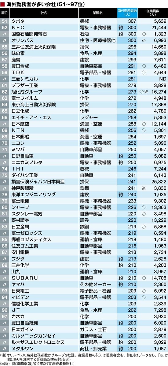 キャリア・教育 #就職四季報プラスワン 前の記事 次の記事 海外勤務者が多い会社トップ200ランキング 1位トヨタは2450人、2位ソニーは1400人 4分で読める 公開日時:2018/01/29 05:00 森 智彦 『就職四季報』編集長 フォロー 1/6 PAGES 2/6 PAGES 3/6 PAGES 4/6 PAGES 次ページが続きます:【海外勤務者が多い会社103~149位】 5/6 PAGES 6/6 PAGES