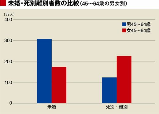 2016年厚労省「人口動態調査」によれば、2015~2016年の1年間で再婚した45~64歳の男性の人数は、約2万8000人、女性は約1万8000人ですから、男性のほうがやはり1万人も多く再婚しています。一方、同じ年齢層でその1年間で死亡した独身男性の数を見ると約3万9000人。再婚数よりも死亡数のほうが1万人も多い。さらに、独身女性の死亡者は約1万4000人ですから、男のほうが3倍近く死亡しているということになります。