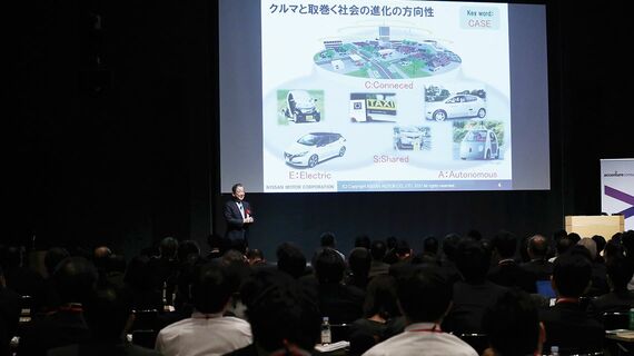 日産自動車の志賀俊之氏は、2050年にはほぼすべての車が、電気自動車(EV)や燃料電池車などになると予測。さまざまなところに電気を貯めて必要な時に必要なだけ供給するバーチャル・パワー・プラントとして、IoTでつないで情報共有したEVの電池を活用する構想を紹介した。