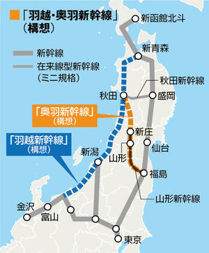 東北には2つの基本計画がある。福島─山形─秋田間を結ぶ「奥羽新幹線」と、富山─新潟─秋田─新青森間を結ぶ「羽越新幹線」だ。どちらも音頭を取るのは山形県。「山形新幹線(福島─新庄間)があるのになぜ」と疑問に思う人も少なくないだろう。