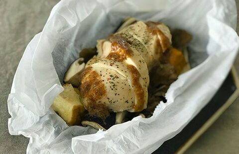 2 クッキングシートに厚揚げ、しいたけ、まいたけをしき、サラダチキンをのせる。酒をかけてクッキングシートの口を閉じる。