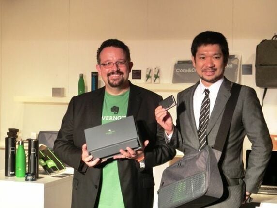 フィル・リービンCEOは米国時間の9月26、27日に開催した「Evernote Conference(EC3)」で発表した新サービスを国内の報道関係者に対し説明してみせた。上写真でリービンCEOが手にしているのはPFUと共同開発した専用スキャナー。そのほかにも、コラボ製品の数々を紹介した。