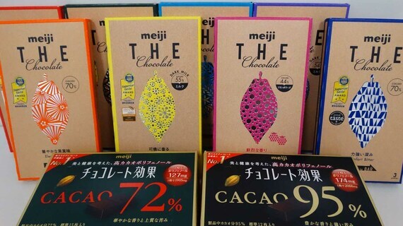 明治の製品群で成長を牽引するのは高カカオ(カカオ分60%以上)を訴求する「チョコレート効果」と「ザ・チョコレート」。明治の推計によれば、高カカオの市場は2014年からの3年間で3倍の115億円になったという。