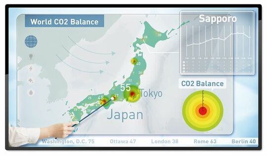 また、同じ画面上に自身のネットワークに接続しているIoTデバイスから得られるCO2排出に関する情報を重ねて見ることもできる。現在、暖房器具や照明、冷蔵庫などの家電製品がIoTに対応をはじめており、スマートフォンがリモコンとして代用できたり、運転状況を確認できたりと、操作性が高まっている。十数年後には、それぞれの製品を使うごとに、どのくらいのエネルギーを消費しているのかをセンシングし、モニタリングすることができるようになると予想される。人間の暮らしから排出される二酸化炭素量を解析し、リアルタイムで表示させることも可能になるのだ。