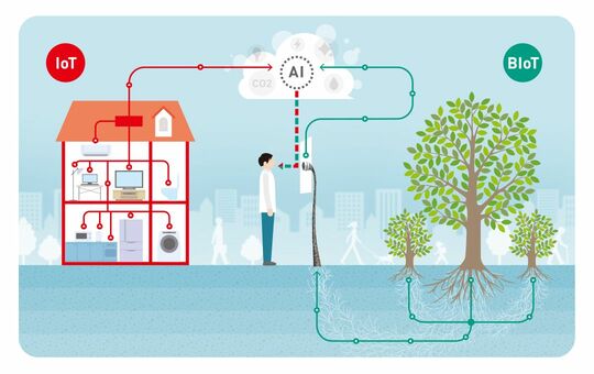 BIoTから得られる情報とIoTから得られる情報をクラウド上でAIが分析し、CO2の排出と吸収のバランスを表示することで、温室効果ガスの削減に向けて一人ひとりが日常生活で消費するエネルギー量を意識できるようにする。具体的には、AIは個々の省エネ行動を誘発するべく、個別の状況に合わせた行動アドバイスを提供する。