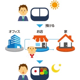 そうした男性にとっての使い勝手の良さを考えた「お弁当DROP&GO」は、極めてシンプルな仕組み。まず、出勤する際に、"マイ弁当箱"を自宅近くの弁当屋や惣菜店に預ける。通常は、プラスチックなどの弁当容器に中身を詰めるところだが、その代わりに"マイ弁当箱"に夕食分の食事を詰めて販売。弁当箱は食事後に自分で洗い再利用する。