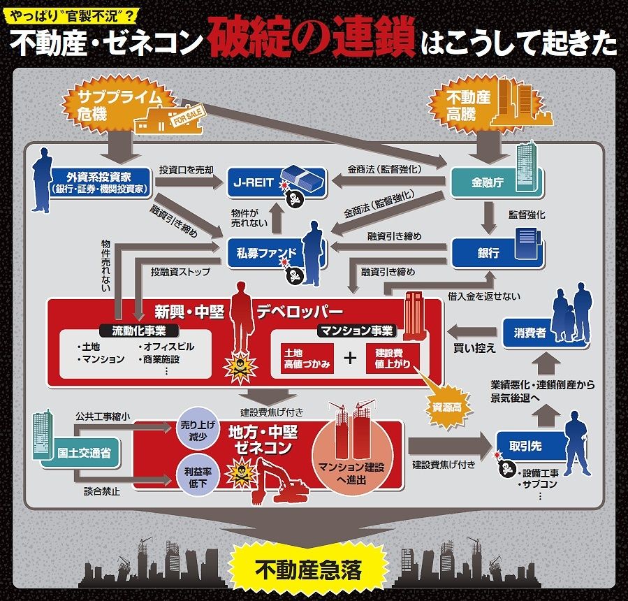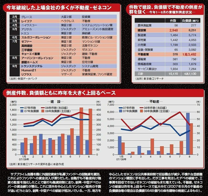 「午後3時過ぎに携帯電話が鳴ると、またデベロッパーかゼネコンが倒産したのかとひやひやする」(不動産ファンド関係者)。今年に入ってから、不動産、ゼネコンの倒産が止まらない。