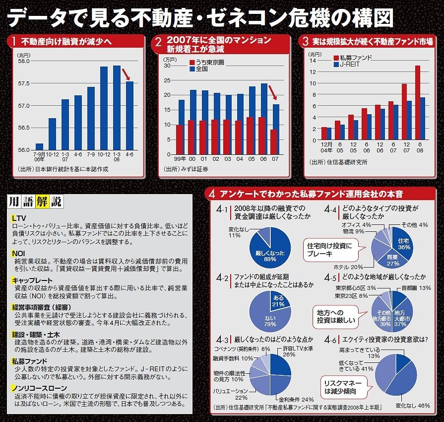 不動産業界には「REITは不動産の最後の買い手なので、当局が守るはず」(ファンド幹部)との見方がある。それでも、初めての事例だけにリプラス・レジデンシャルの今後には注目が集まる。世界的金融動乱のさなかにあって、不動産、ゼネコン、マンションを揺るがす激震は未体験の領域に突き進んでいる。