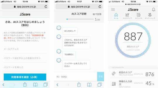 トップ画面からメールアドレスを入力してアカウントを作成する。ここでは氏名や住所といった個人を特定する情報は不要で、ニックネーム、性別、生年月、最終学歴、大まかな年収など、18問の基本的な情報をチャット形式で答えるだけ。ここまでで所要時間はたったの1~2分程度。必要なのはメールアドレスのみだ。質問に答えると1000点を上限とする「AIスコア」が画面上に表示される。
