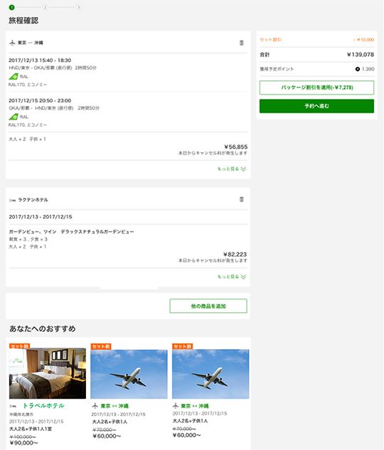 予約途中の画面。宿泊施設、フライトなどを選択すると、旅程の形で見やすく一覧表示される。すべて選択し終えたら、一括で予約へ